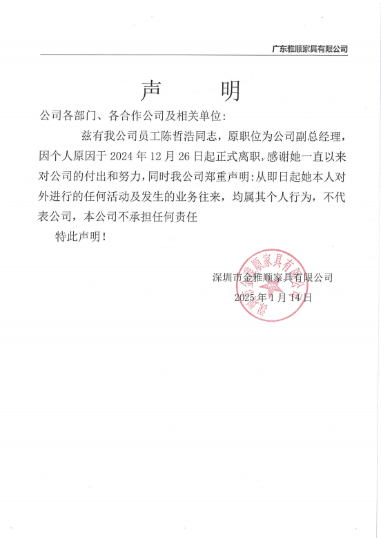 茲有我公司員工陳哲浩同志,原職位為公司副總經(jīng)理因個(gè)人原因于2024年12月26日起正式離職,感謝她一直以來對(duì)公司的付出和努力,同時(shí)我公司鄭重聲明:從即日起她本人對(duì)外進(jìn)行的任何活動(dòng)及發(fā)生的業(yè)務(wù)往來,均屬其個(gè)人行為,不代表公司,本公司不承擔(dān)任何責(zé)任!